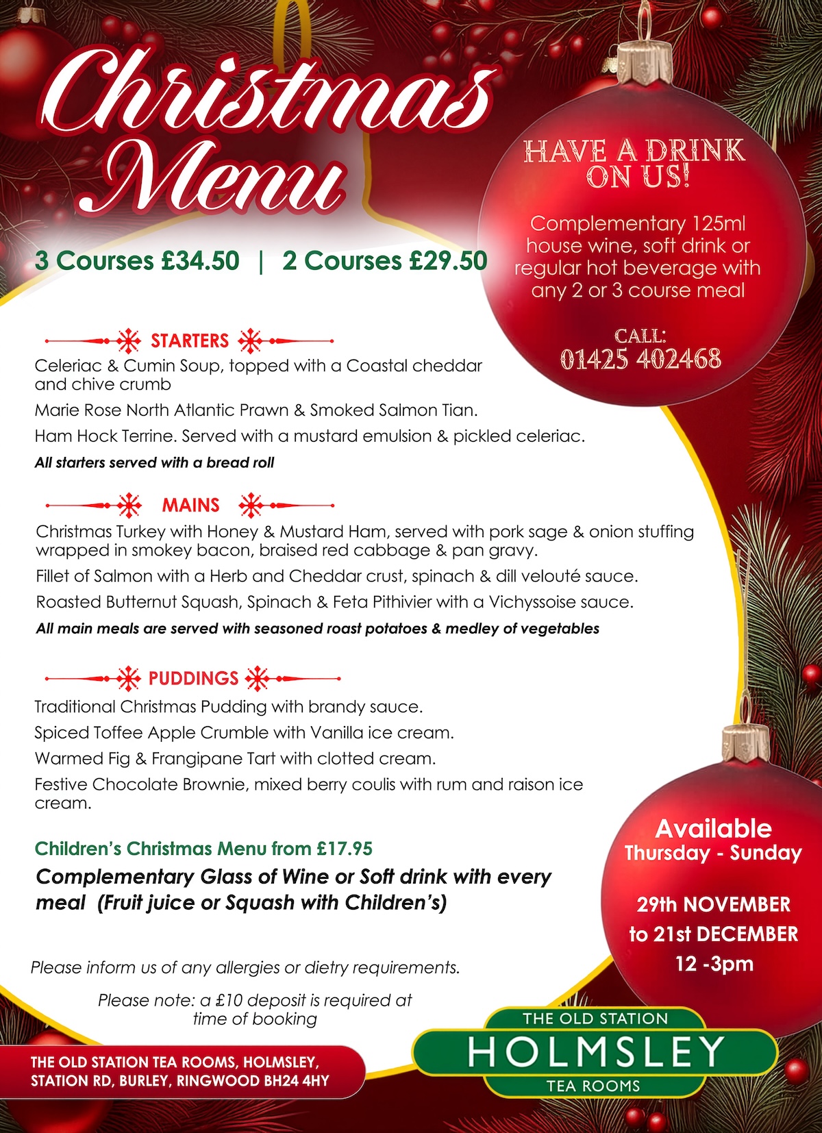 Christmas Menu 2025admin2025-11-05T11:58:16+00:00 Christmas is coming to The Old Station Tea Rooms!Book your Christmas Lunch at the Old Station Tea Rooms today by calling 01425 402468, and join us for well cooked traditional festive food, and enjoy a drink on us!